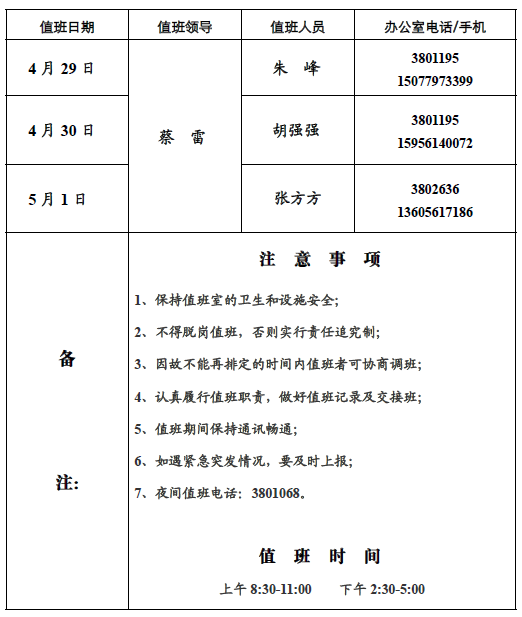 英国best365官方网站入口(滨湖校区)后勤管理与服务处2018年五一假期值班表