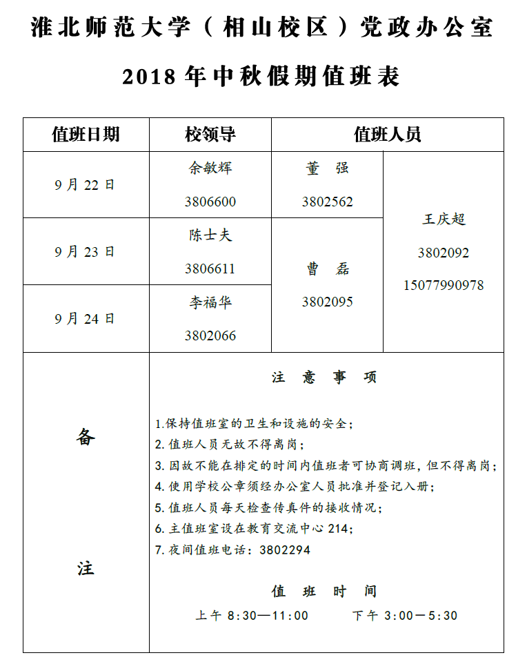 英国best365官方网站入口(相山校区)党政办公室 2018年中秋假期值班表