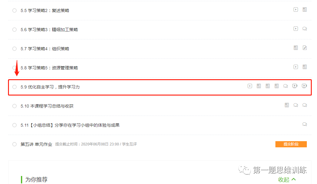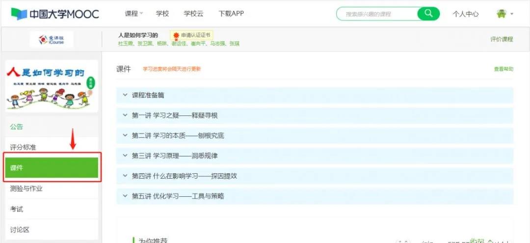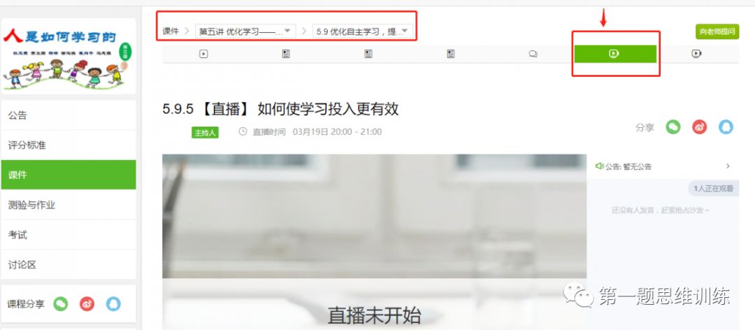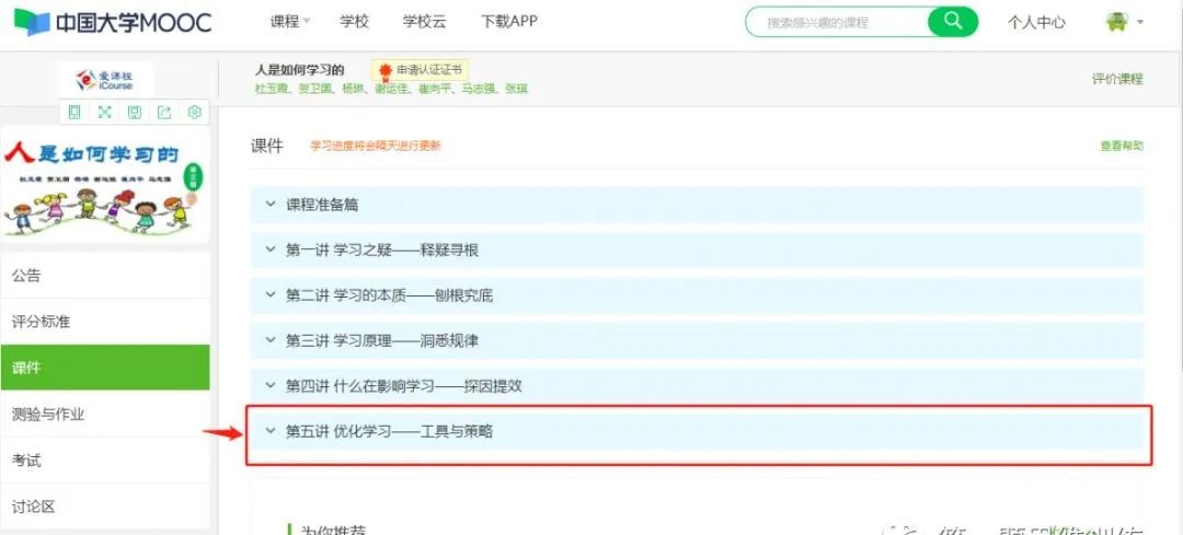 打开链接进入中国大学MOOC《人是如何学习的》课程后,点击左侧课件,选第五讲的《5.9 优化自主学习,提升学习力中》看直播。