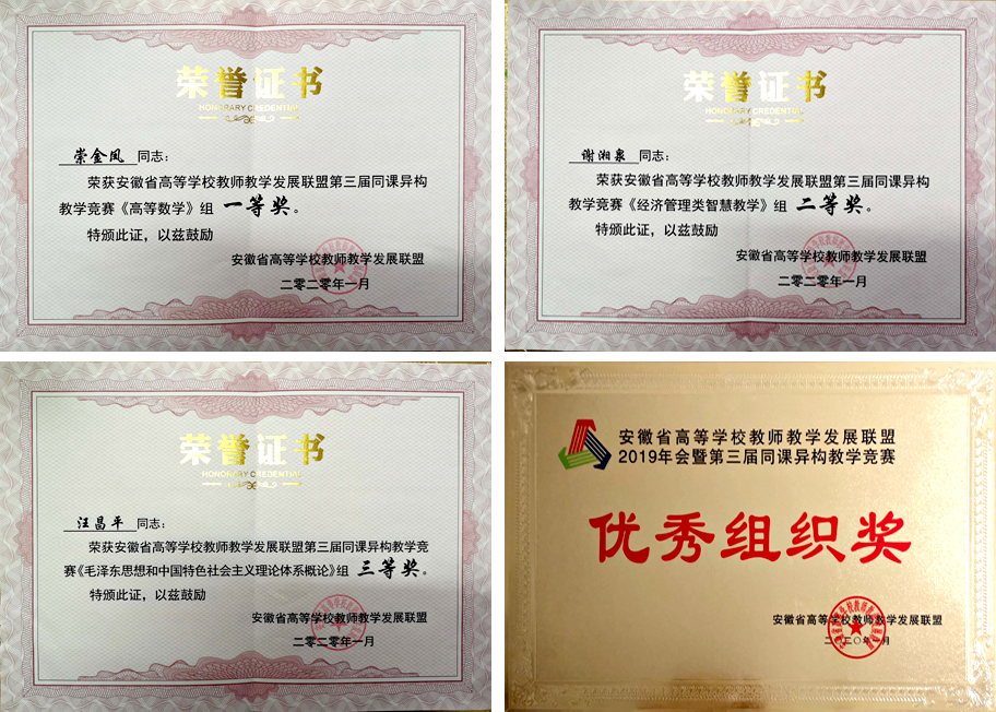 1月3日-5日,安徽省高等学校教师教学发展联盟2019年年会暨第三届同课异构教学竞赛在安徽财经大学举行。来自安徽省高等学校教师教学发展联盟20所高校60余名教师参加了本次竞赛。竞赛设高等数学、思政课和经管类智慧教学三个类别。365官网数学科学学院教师崇金凤、经济与管理学院教师谢湘泉和马克思主义学院教师汪昌平参加竞赛,分别荣获高等数学组一等奖、经管类智慧教学组二等奖和思政组三等奖。学校荣获优秀组织奖。