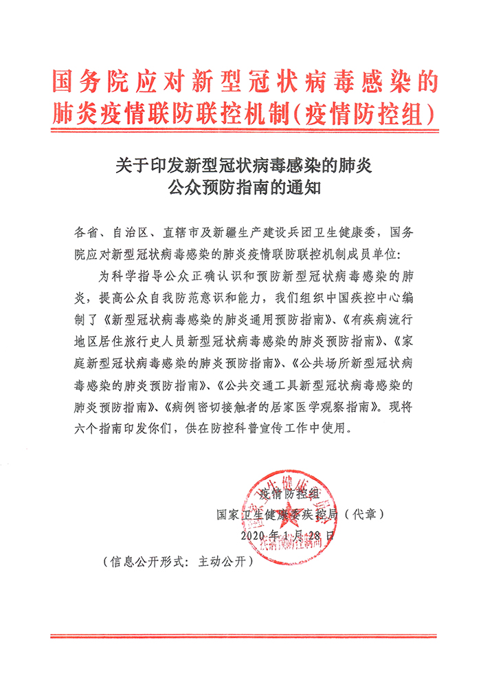 【疫情防控专栏】关于印发新型冠状病毒感染的肺炎公众预防指南的通知 来源:党委宣传部 发布时间:2020-01-29 15:29:22 浏览次数: 次 【字体:小 大】 附件:《关于印发新型冠状病毒感染的肺炎公众预防指南的通知》 分享到: 【打印正文】