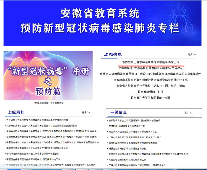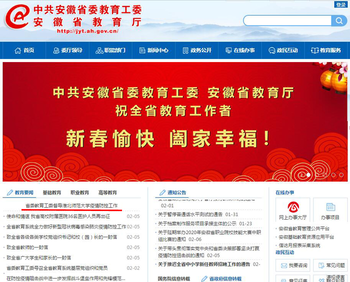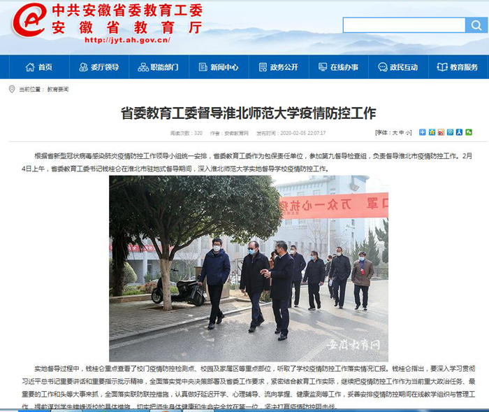 《安徽教育网》2月5日“教育要闻”首页和“一线传真”专题,以《省委教育工委督导英国best365官方网站入口疫情防控工作》为题,头条报道省委教育工委书记钱桂仑实地督导365官网疫情防控工作。