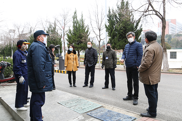 校领导重点巡查学校目前唯一开放的北门,询问门卫防控管理措施,特别是查看人员登记和体温检测情况。检查物业管理和消毒情况、附中侧门封闭情况、学生宿舍侧墙严格管理情况,询问校医院值班、后勤服务与管理处疫情防控物资储备等情况。看望慰问疫情防控一线工作人员,对大家坚守疫情防控一线表示感谢,同时叮嘱值守人员要做好自身防护,确保自身安全。
