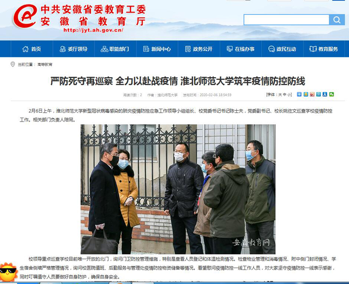 《安徽教育网》2月6日“高等教育”专栏以《严防死守再巡察 全力以赴战疫情 英国best365官方网站入口筑牢疫情防控防线》为题,报道365官网新型冠状病毒感染的肺炎疫情防控应急工作领导小组组长、校党委书记书记陈士夫,党委副书记、校长姚佐文巡查学校疫情防控工作。