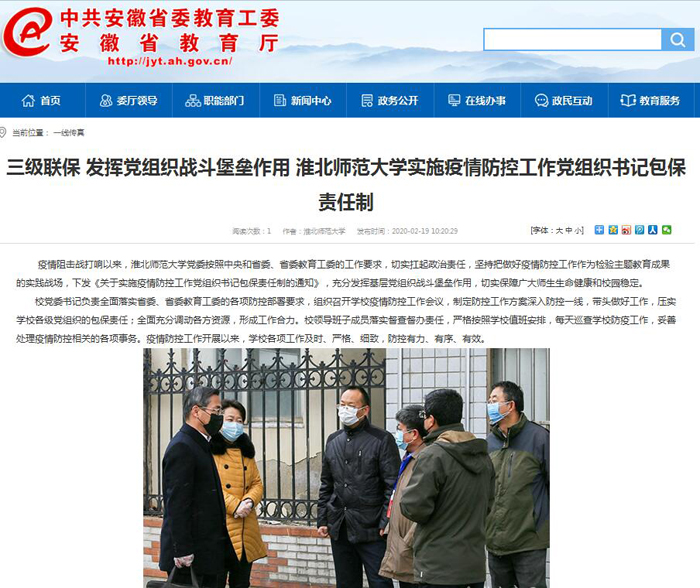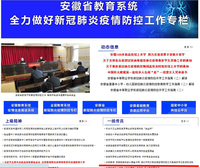 疫情阻击战打响以来,英国best365官方网站入口党委按照中央和省委、省委教育工委的工作要求,切实扛起政治责任,坚持把做好疫情防控工作作为检验主题教育成果的实践战场,下发《关于实施疫情防控工作党组织书记包保责任制的通知》,充分发挥基层党组织战斗堡垒作用,切实保障广大师生生命健康和校园稳定。2月19日,《安徽教育网》“安徽省教育系统全力做好新冠肺炎疫情防控工作专栏”首页对此进行了关注和报道。