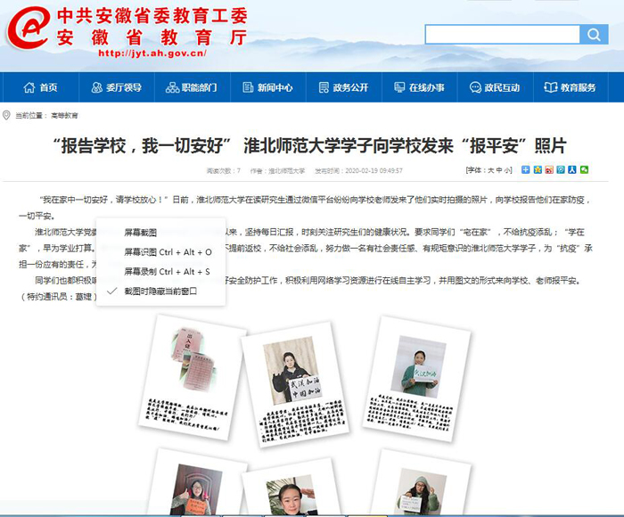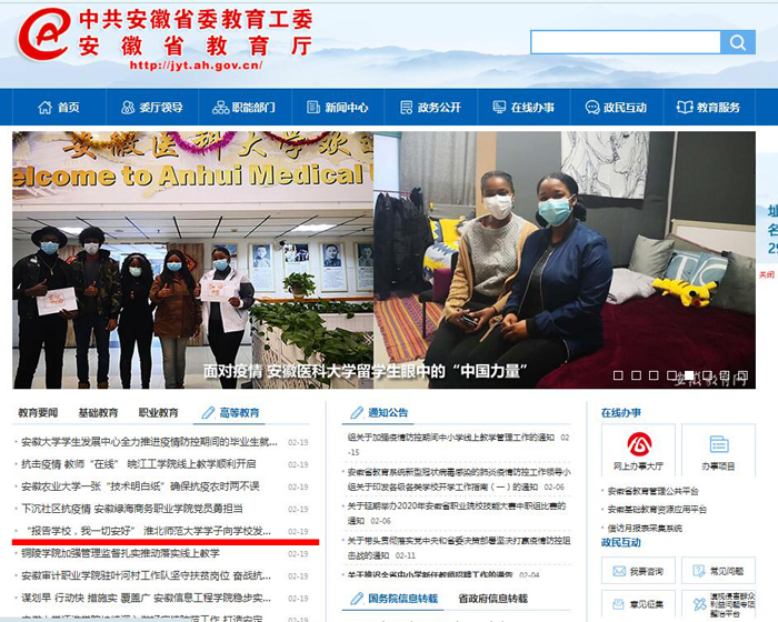 【安徽教育网】首页:“报告学校,我一切安好” 英国best365官方网站入口学子向学校发来“报平安”照片 来源:党委宣传部 发布时间:2020-02-19 14:19:10 浏览次数: 次 【字体:小 大】 英国best365官方网站入口党委研究生工作部在防疫抗疫工作开展以来,坚持每日汇报,时刻关注研究生们的健康状况。同学们也都积极响应号召,用图文的形式来向学校、老师报平安。2月19日,《安徽教育网》“高等教育”板块,首页对此进行了关注和报道。链接地址:http://jyt.ah.gov.cn/28/view/672396.shtml 分享到: 【打印正文】