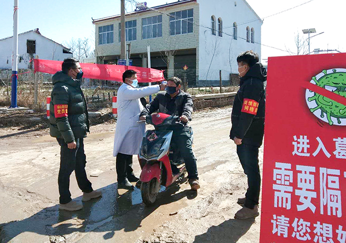 在村里,工作队同村两委、村民小组长逐户排查摸排武汉返村人员,查询是否与武汉返村人员有接触史,询问他们是否有发热、咳嗽等症状;对武汉返村人员进行隔离,并协助做好详细档案记录。为掌握外来人员及发热人员动态,村里实行网格化管理,群防群控,做到“不漏一户、不落一人”。为阻断外界传播,工作队员严格落实管控制度,每日在村设置的防控劝返站点,耐心劝返进村和外出村民,并同村两委对各站点进行检查和督查。