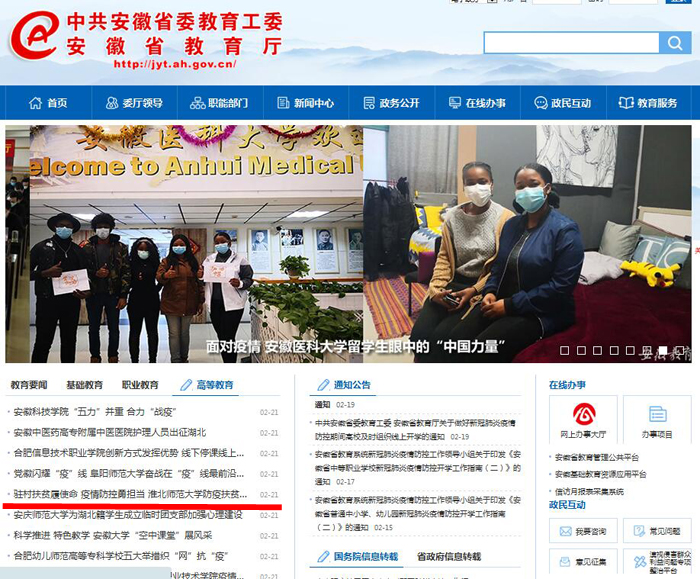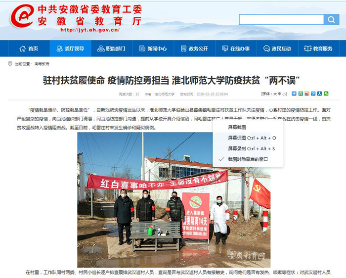 自新冠肺炎疫情发生以来,英国best365官方网站入口驻砀山县葛集镇毛雷庄村扶贫工作队关注疫情,心系村里的疫情防控工作。面对严峻复杂的疫情,向当地组织部门请缨,同当地防控部门沟通,提前从学校开具介绍信函,同毛雷庄村广大党员干部、志愿者群众一起奋战在抗击疫情一线,由扶贫攻坚战转入疫情阻击战。2月21日,《安徽教育网》首页对此进行了关注和报道。