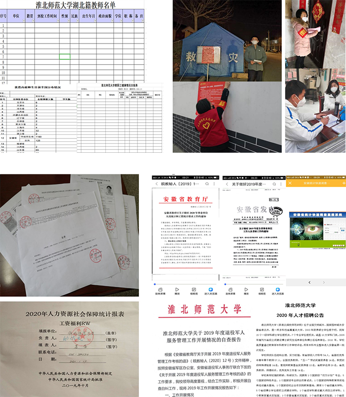 在学校人事人才工作中,集思广益,拓展全新工作方式,加大人事人才服务事项“线上办”,稳步开展人事人才工作。通过网络与省人社厅、教育厅和编办及时汇报沟通,认真做好2020年全国先进工作者候选人推荐、2020年编制使用计划申报、2019年退役军人服务管理自查等工作。同时,以线上、线下相结合的方式,在分管校领导的指导下,邀请专家完成2020年人才招聘方案制定与审核、2020年度拔尖人才项目材料初审、公示和推荐等工作;在财务处等部门的支持下,仔细做好教职员工年终结算、工资福利待遇、养老保险、教职工年度考核汇总等其他常规性业务工作。此外,人事处(党委教师工作部)上下保持电话、微信、短信、邮件畅通,积极进行人才引进宣传,及时热情解答应聘者关心关注的问题。