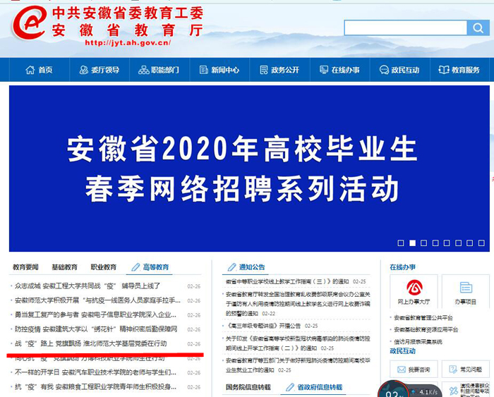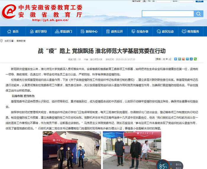 新冠肺炎疫情发生以来,365官网党委坚持统一领导、靠前指挥、迅速应对,带领全校师生员工全力以赴、严密防控、科学有序推进疫情防控。各基层党委充分发挥基层党组织战斗堡垒作用和党员先锋模范作用,为确保打赢疫情防控阻击战、平安校园保卫战作出积极贡献。2月26日,《安徽教育网》首页对此进行了关注和报道。