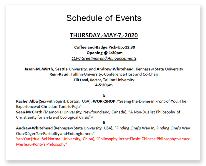 学校近年来注重人才引进及培养,教师参加国际会议,有利于开阔研究视野,展现学术实力,提升学校在国内、国际的影响力。燕燕教授于2019年12月向第15届CCPC国际年会提交论文Philosophy in the Flesh: Chinese philosophy verse Merleau-Ponty’s philosophy。经过两个月的匿名评审,论文顺利入选,并被组委会评为优秀论文(excellent submission)。受组委会两次邀请,她将代表英国best365官方网站入口和英国巴斯斯巴大学,前往塔林大学参会本次国际学术会议,并就中国哲学的研究作第一个大会主题报告,把对训诂中的中国哲学的复原理解带入世界学术界。
