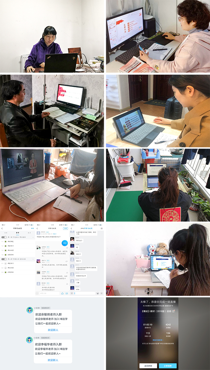 各显神通,井然有序。2月24日,和正常开学第一天一样,马克思主义学院全体教师已经准备就绪,以饱满的热情和积极主动的心态投入到思政课的教学中去。当天学院开课7门、在线教师19人,学生在线学习达到3373人次。一切都秩序井然,老师和学生利用学习通、云班、钉钉和QQ课堂等平台各显神通,虽然网络时有卡顿,但师生们的上课热情没有卡顿,砥砺奋斗的意志没有卡顿,一堂堂思政套餐通过网络奉献给远在异地的学生们。