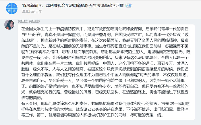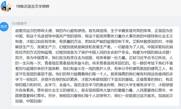课后,广大学子纷纷表示,这是一堂发人深省、意义深远的大课,虽然自己未能亲临战“疫”主场,但在这场抗“疫”大战中,青年学子应坚定信心,奋勇前行,不负韶华。他们这样说: