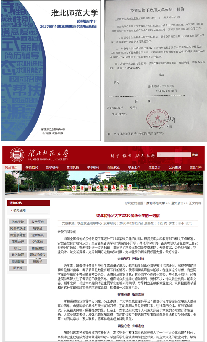 未雨绸缪,“云端” 谋划早部署。疫情发生后,学校成立了疫情防控期间毕业生就业工作领导小组。1月28日,校党委副书记朱德顺电话部署就业工作,要求提前谋划。学生就业指导中心研判就业形势,印发了《关于做好疫情防控期间2020届本科毕业生就业工作的通知》,细化任务,明确责任。联合创新创业教育学院、新锦城开展了《英国best365官方网站入口疫情条件下2020届毕业生就业形势调查》,联和各学院分别发布了《致2020届毕业生的一封信》和《致用人单位的一封信》,确保疫情防控期间毕业生就业工作顺利开展。
