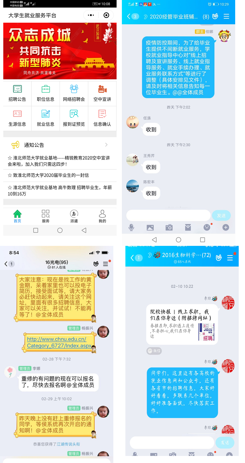 提高效能,“云端”服务全天候。全面简化就业手续,公务员面试推荐表、政审函、就业推荐表、调整改派等急需材料,实行“网络+快递”方式办理。完善网络签约系统,实行线上签约,实时统计就业数据,定期反馈跟进。依托学校就业网、微信就业小程序、QQ群、钉钉群等平台,构建起延时短、无死角、全覆盖的立体化信息发布机制。先后编写并发布了《就业服务平台学生端操作手册》和《就业服务平台网络签约说明书》。