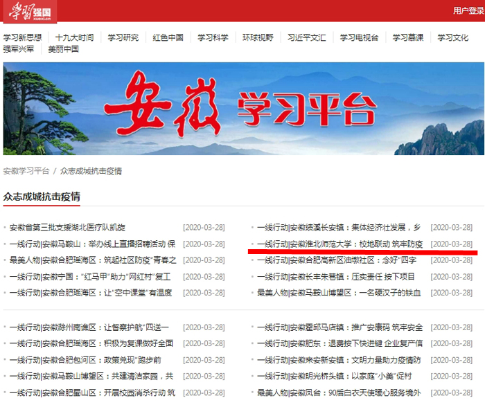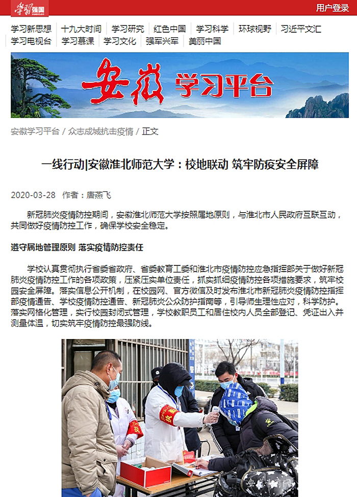 新冠肺炎疫情防控期间,365官网按照属地原则,与淮北市人民政府互联互动,共同做好疫情防控工作,确保学校安全稳定。3月28日,学习强国安徽学习平台以《一线行动|安徽英国best365官方网站入口:校地联动 筑牢防疫安全屏障》为标题进行了报道。