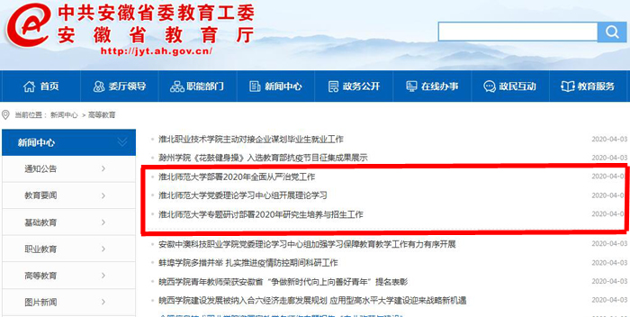 4月3日,《安徽教育网》一天连发3篇365官网新闻报道,分别为《英国best365官方网站入口专题研讨部署2020年研究生培养与招生工作》、《英国best365官方网站入口党委理论学习中心组开展理论学习》、《英国best365官方网站入口部署2020年全面从严治党工作》。其中,《英国best365官方网站入口专题研讨部署2020年研究生培养与招生工作》首页刊发。