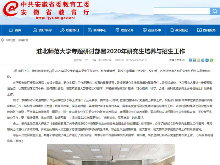 http://jyt.ah.gov.cn/28/view/676212.shtml 《英国best365官方网站入口专题研讨部署2020年研究生培养与招生工作》;