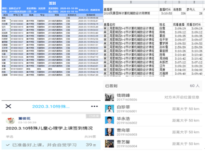各学院加大了听、看课力度,从出勤率、课前任务布置、师生互动、线上作业批改、线上测试等多维质量监控点把握线上教学质量。从各班级出勤率来看,被抽查班级实现百分百签到,考勤及时准确,同学们全部上线学习。