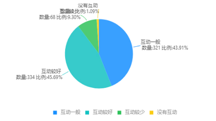 在线互动情况。98.91%的教师能够组织课堂互动,并且45.69%的教师互动较好,仅有9.30%互动较少。