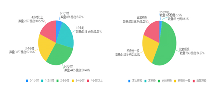 问卷对学生学习时间和学习状态进行了调查,结果显示,大部分学生每日学习三小时左右,学习状态比较积极,已开启正式学习模式。