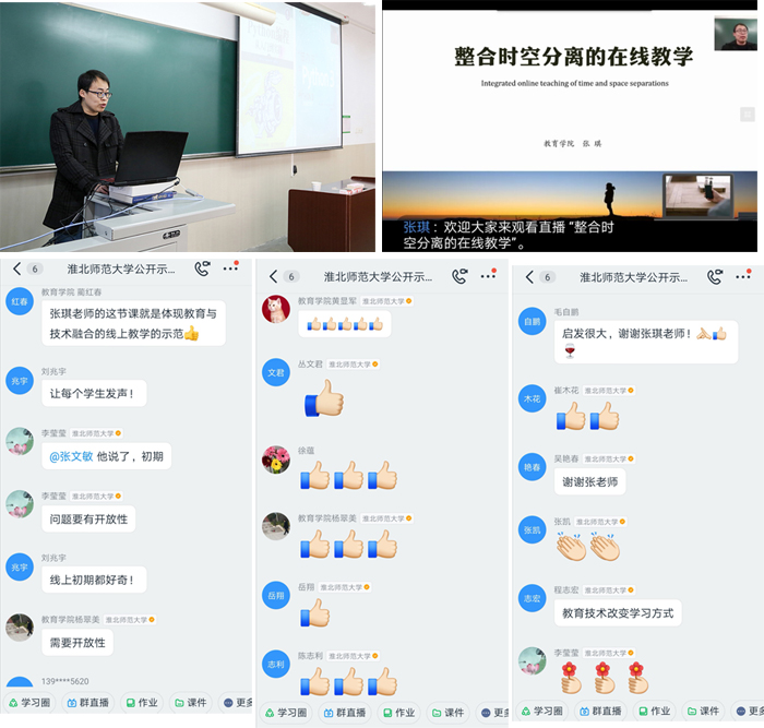 4月22日下午,学校第六期线上教学公开示范课在相山校区文北103举行。教育学院张琪副教授通过钉钉直播群面向全校教师分享《整合时空分离的在线教学》主题教学。副校长李福华一如既往与特邀专家一同现场听评。