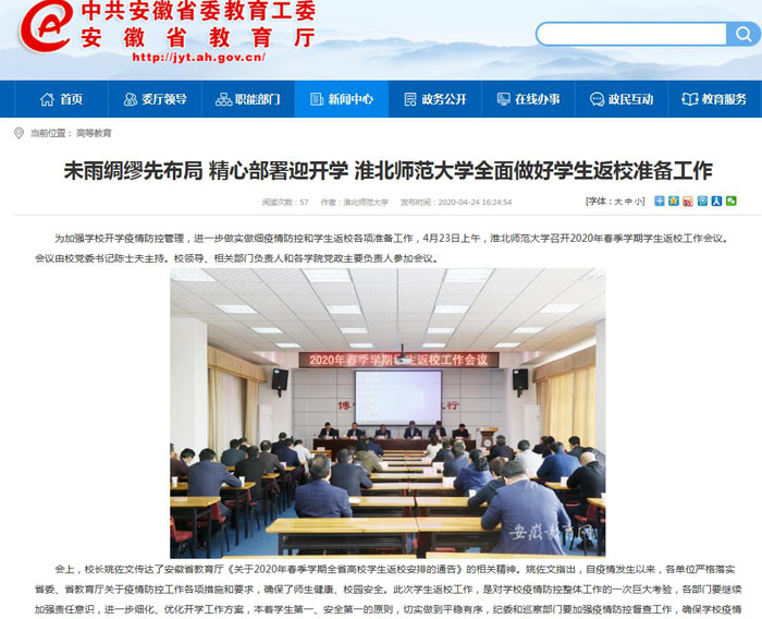 为加强学校开学疫情防控管理,进一步做实做细疫情防控和学生返校各项准备工作,4月23日上午,365官网召开2020年春季学期学生返校工作会议。4月26日,安徽教育网首页以《未雨绸缪先布局 精心部署迎开学 英国best365官方网站入口全面做好学生返校准备工作》为标题进行了报道。