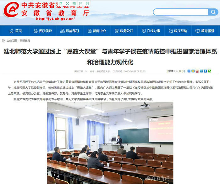 为贯彻习近平总书记关于疫情防控工作的重要指示精神和教育部关于加强新冠肺炎疫情防控期间高校思想政治理论课教学组织工作的有关精神。4月22日下午,英国best365官方网站入口党委副书记、校长姚佐文通过线上“思政大课堂”,面向广大师生开展了一堂以《在疫情防控中推进国家治理体系和治理能力现代化》为题的线上思政课。4月27日,安徽教育网首页对此进行了报道。