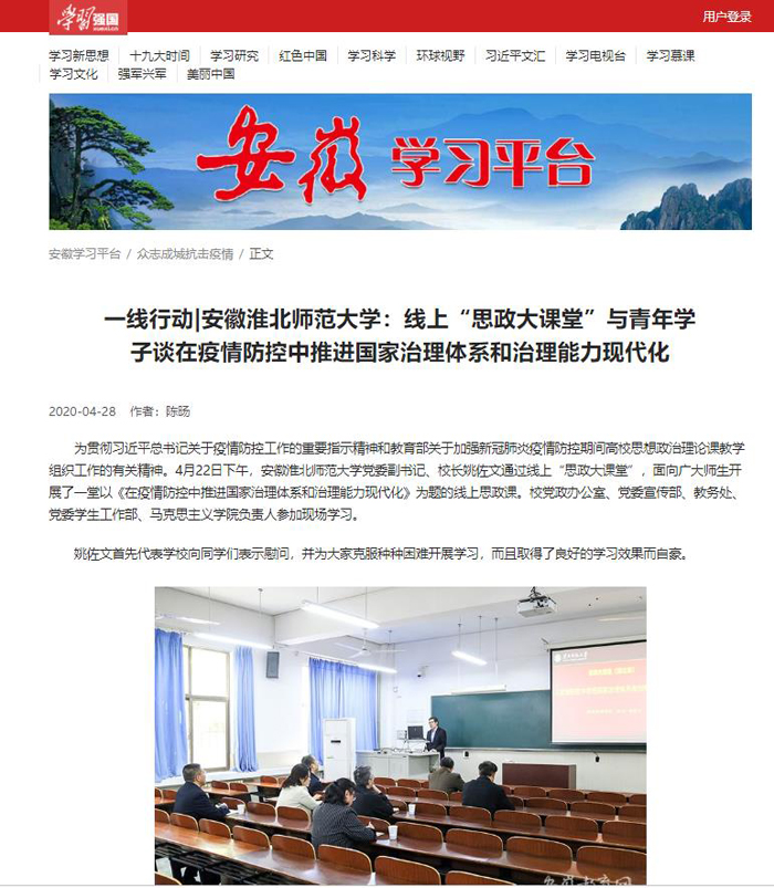 为贯彻习近平总书记关于疫情防控工作的重要指示精神和教育部关于加强新冠肺炎疫情防控期间高校思想政治理论课教学组织工作的有关精神。4月22日下午,安徽英国best365官方网站入口党委副书记、校长姚佐文通过线上“思政大课堂”,面向广大师生开展了一堂以《在疫情防控中推进国家治理体系和治理能力现代化》为题的线上思政课。4月28日。“学习强国”安徽学习平台对此进行了报道。