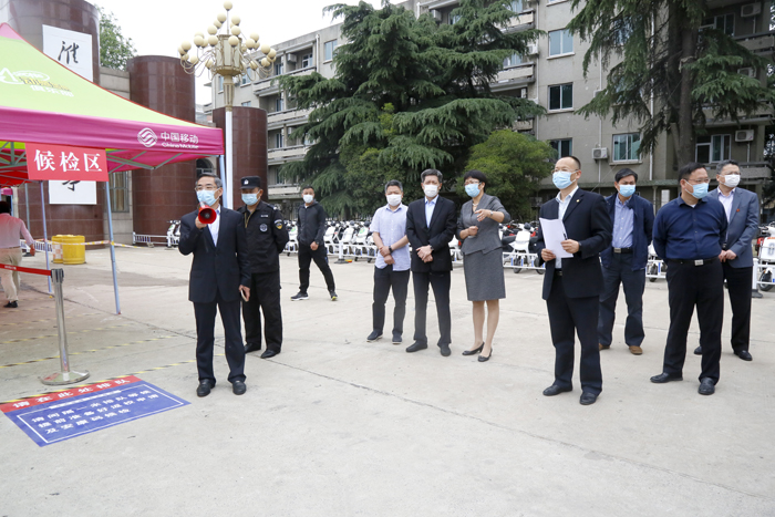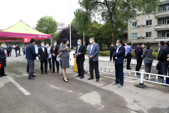 校领导在每个演练现场都仔细询问一些工作细节,了解可能出现问题的准备和处置方案,叮嘱工作人员要加强个人防护,在确保安全的前提下进一步优化学生入校流程。