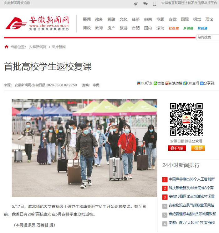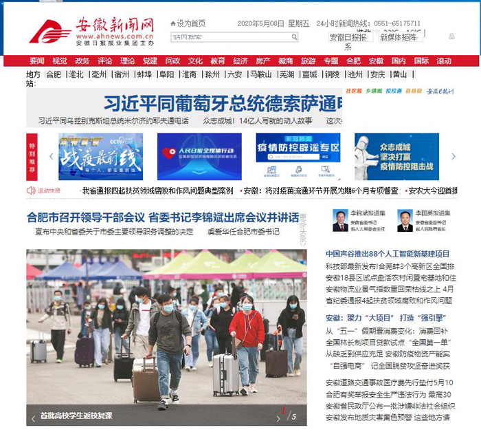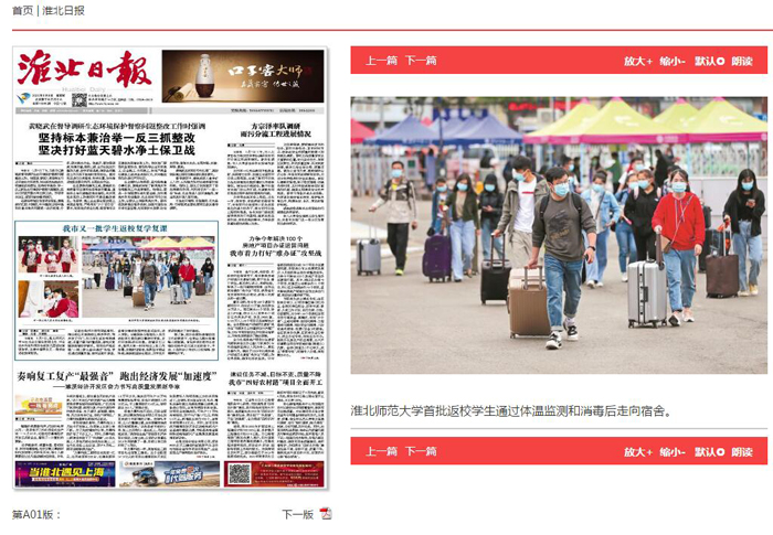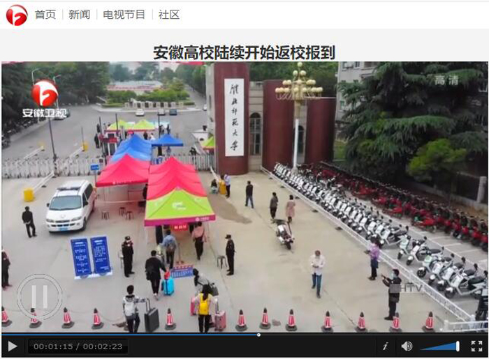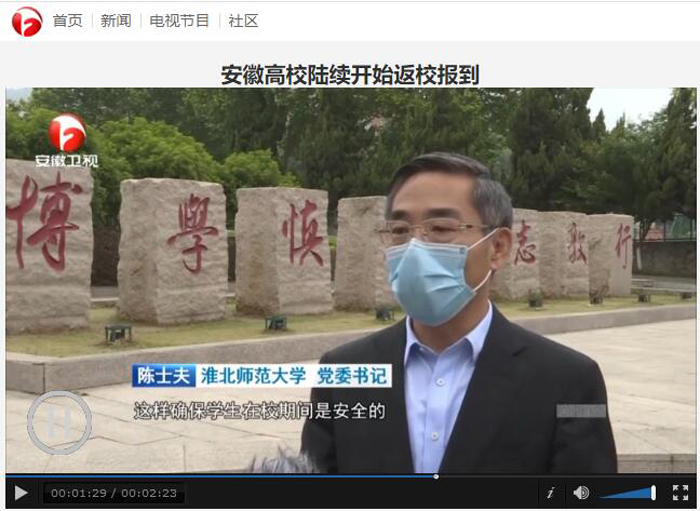 5月7日,365官网迎来了2020年春季学期错峰开学的第一批返校学生。学生开学返校工作得到了淮北市传媒中心的全方位支持,外宣新闻部、时政新闻部和摄美部的多位记者进行了现场新闻采访。当天,安徽卫视《安徽新闻联播》、《安徽日报》头版、全省新闻联播广播《安徽之声》、《安徽新闻网》头版以及《淮北新闻联播》、《淮北日报》头版、淮北传媒中心官微等省内主流媒体分别对此进行了关注和报道。365官网党委书记陈士夫在《安徽新闻联播》、《安徽之声》、《淮北新闻联播》中接受专访。