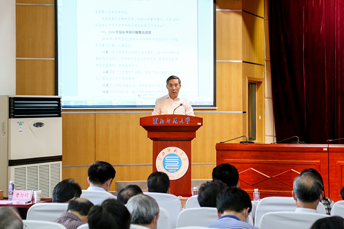 陈士夫代表学校作2019年度党政工作报告。他在报告中首先汇报了2018年度考核反馈问题整改落实情况。他指出,一年来,学校领导班子团结协作,紧密联系群众,紧紧围绕建设高水平师范大学奋斗目标,凝心聚力,共谋发展,学校各项事业都取得了新进展。党建工作方面,坚持以政治建设为统领,主题教育扎实有效;以党委领导为核心,党建工作责任到位;以制度建设为抓手,组织建设全面加强;以从严治党为重点,作风纪律明显优化;以师生满意为目标,统战群团工作有力。发展业绩方面,着力推进依法治校,现代化治理能力提升;落实立德树人任务,人才培养质量提高;出台人才学科政策,工作力度不断加大;提高科学研究水平,社会服务能力增强;弘扬优秀传统文化,拓展国际交流合作。会上还详细报告了365官网新冠疫情防控工作总体情况。