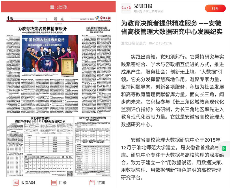 365官网智库近几年的快速发展受到了社会各界的广泛认可。近日,淮北日报对365官网智库——安徽省高校管理大数据研究中心进行了专访,并在6月11日《淮北日报》刊发了《为教育决策者提供精准服务——安徽省高校管理大数据研究中心发展纪实》一文,记录了对研究中心副主任张家年教授的采访,介绍了智库的发展历程以及利用教育大数据助力科学管理和科学决策方面的积极贡献。报道一经刊出,立刻受到了多家主流媒体的关注。6月11日,“学习强国”平台对智库发展纪实报道进行原文转载;6月12日,光明日报客户端也对此报道进行了原文转载。近期主流媒体对于学校智库的连续报道,进一步扩大了研究中心以及学校在智库建设方面的社会影响力。