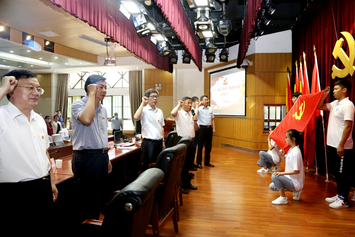大会第二阶段为“党课开讲啦”启动仪式。在校党委书记陈士夫的带领下,全体党员重温了入党誓词,在党旗下接受党性的洗礼和净化。校党委副书记朱德顺宣读了学校《关于组织开展“党课开讲啦”活动的通知》。