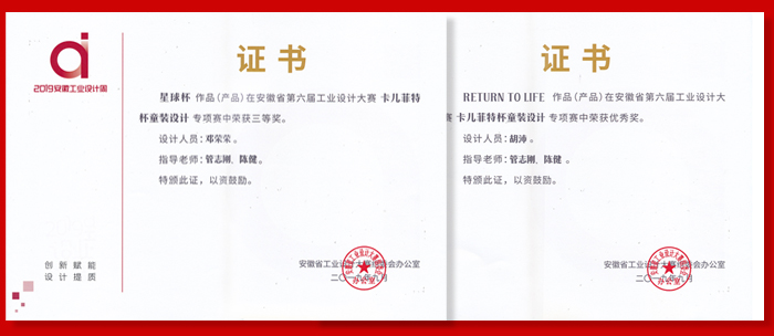 近日,美术学院师生陆续收到各类学科竞赛和艺术展演入选与获奖证书。在“安徽省第六届工业设计大赛”中,由教师管志刚、陈健指导学生邓荣荣、胡沛创作的《星球杯》《RETURN TO LIFE》作品分别获大赛“卡儿菲特杯童装设计”专项赛“三等奖”“优秀奖”。