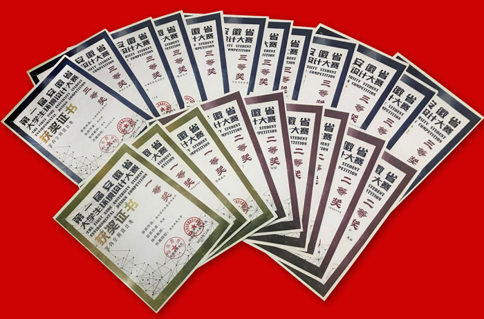 在由安徽省教育厅主办的“第一届安徽省大学生环境设计大赛”中共获奖21项,包括“一等奖”3项、“二等奖”6项、“三等奖”12项。