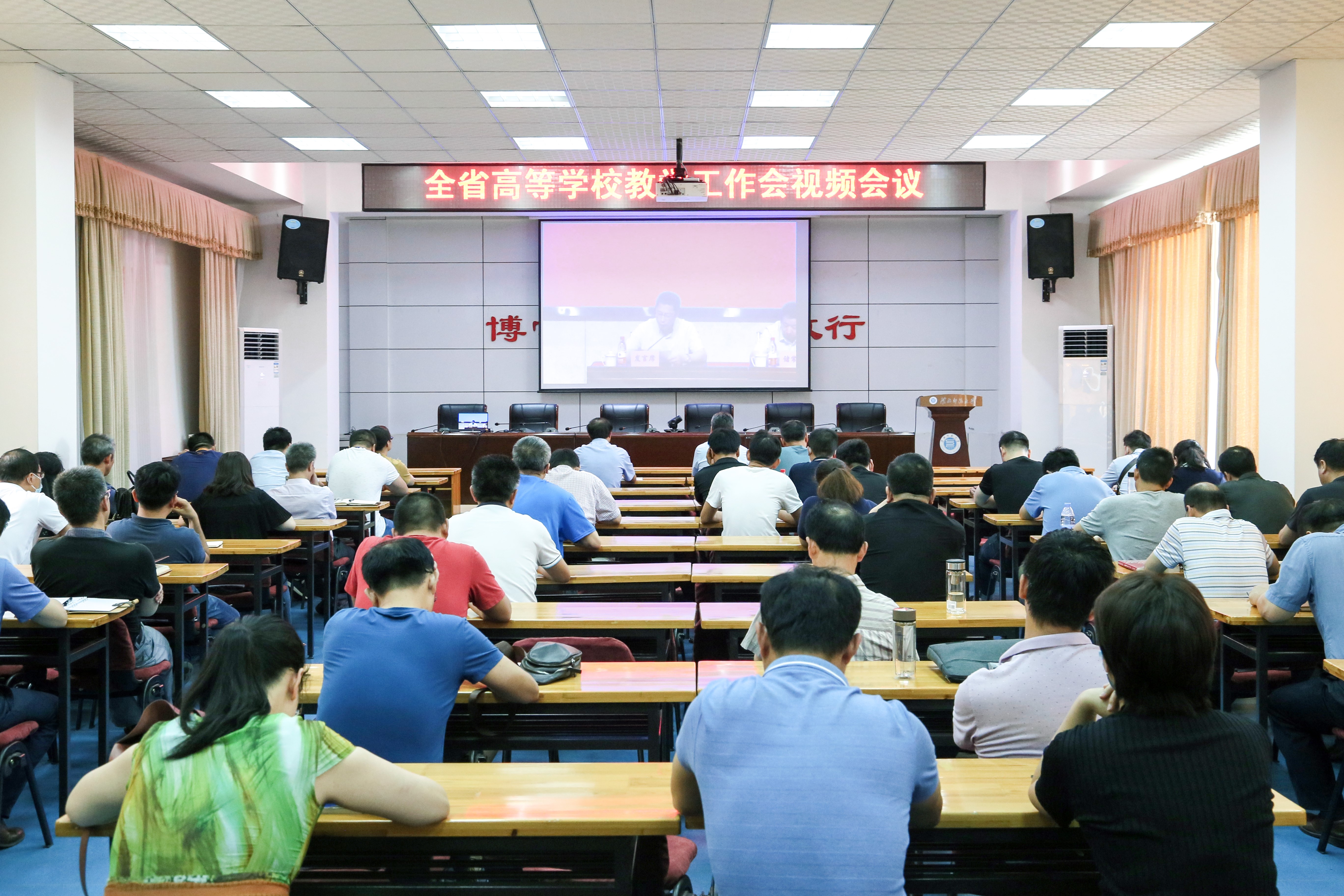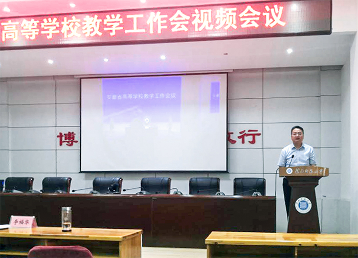 为深入贯彻落实教育部全面推进高等学校课程思政建设工作视频会议和2020年全国高教处长会议精神,进一步做好新冠肺炎疫情常态化防控下高校教学工作,2020年7月3日,全省高等学校教学工作会在合肥学院召开。会议采取线上线下结合的形式召开,合肥各高校线下参加主会场会议,外地高校线上通过视频分会场参加会议。省委教育工委委员、省教育厅副厅长储常连出席会议并讲话,省内各高校领导出席会议,会议由省教育厅高教处梁祥君主持。