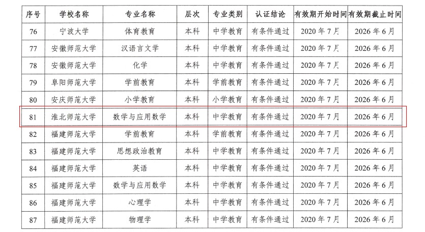 7月17日,教育部办公厅下发《关于公布2020年通过普通高等学校师范类专业认证的专业名单的通知》(教师厅函[2020]8号),365官网数学与应用数学(师范)专业顺利通过中学教育第二级认证,有效期限为2020年7月至2026年6月,是安徽省首批通过的师范类专业第二级认证的5个专业之一,也是全省首个通过认证的数学与应用数学专业。
