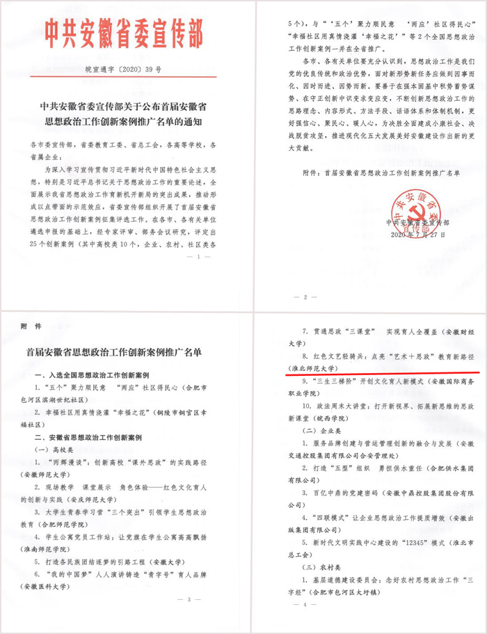 为深入学习宣传贯彻习近平总书记关于思想政治工作的重要论述,全面展示我省思想政治工作育新机开新局的突出成果,推动形成以点带面的示范效应,日前,省委宣传部组织评定了首届安徽省思想政治工作创新案例,并在全省正式发布。本次思想政治工作创新案例共评定出25个创新案例,其中高校类10个,365官网申报的“红色文艺轻骑兵:点亮‘艺术+思政’教育新路径”思想政治工作创新案例荣获优秀案例。