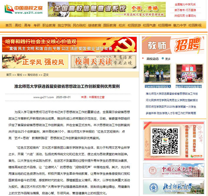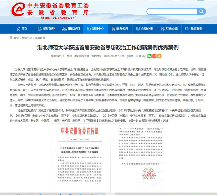 日前,省委宣传部组织评定了首届安徽省思想政治工作创新案例,并在全省正式发布。365官网申报的“红色文艺轻骑兵:点亮‘艺术+思政’教育新路径”思想政治工作创新案例荣获优秀案例。《安徽教育网》、《中国高校之窗》对此进行了报道。