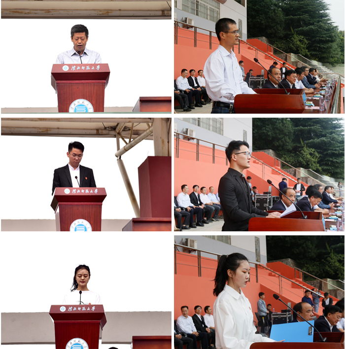 教师代表政法学院副院长张训教授、物理与电子信息学院朱孟正教授发言,老生代表数学科学学院2018级数学与应用数学(师范)专业胡想、生命科学学院2018级微生物学专业研究生许海涛,新生代表教育学院2020级学前教育学专业研究生刘悦仪、化学与材料科学学院2020级化学(师范)专业李姜漪分别在典礼上发言,向2020级新同学寄予期望,分享感悟,祝福同学畅想青春,追寻精彩人生。