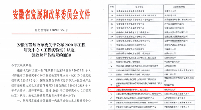 日前,省发改委下发《安徽省发展改革委关于公布2020年工程研究中心(工程实验室)认定、验收及评估结果的通知》(皖发改创新[2020]554号),365官网申报的“安徽省特色资源植物利用工程实验室”获批立项建设。