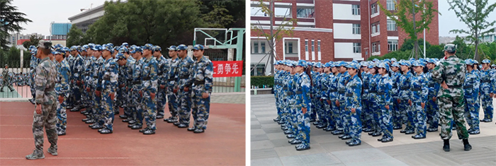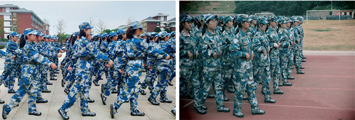 虽然寒露已至,但午日的阳光依旧热烈,炙烤着一寸寸草地、一片片坚硬的石板地,却丝毫不减身着蓝绿色迷彩军装新生们昂扬的青春活力。下午2时左右,在明德广场和西操场,长达近半月的军训正式开始。教官们迈着整齐的脚步向各个学院的新生们走来,将自己负责的班级带到指定位置。即刻,一条条蓝绿色的长条变换成一块块整齐的方阵。站军姿、原地踏步、跨步、前后左右转向等基本动作是教官给新生们上的第一课。戎装加身,飒爽英姿,青春风采在飞扬的汗水中彰显。天气炎热及考验耐力的军训演练使部分新生出现了身体不适的情况,不过在及时报告给教官允许休息后,很快就得到了缓解与恢复。每位教官在训练时也时刻注意着新生的身体情况并进行适时的调整。教官于新生们而言,是严格的,亦是亲切的,是铁血,但也不乏柔情。