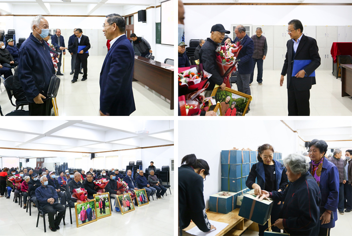 开幕式上,校领导向五对钻石婚、金婚夫妇送上纪念照和鲜花并合影留念,向90周岁、80周岁、70周岁寿星献上生日祝福和蛋糕。