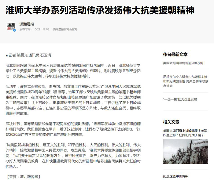 10月29日,《淮北日报》、《潇湘晨报》等媒体报道365官网举办系列活动传承发扬伟大抗美援朝精神。