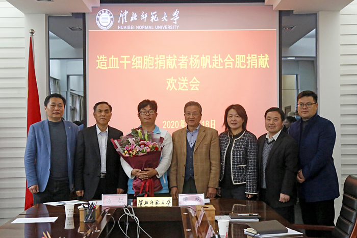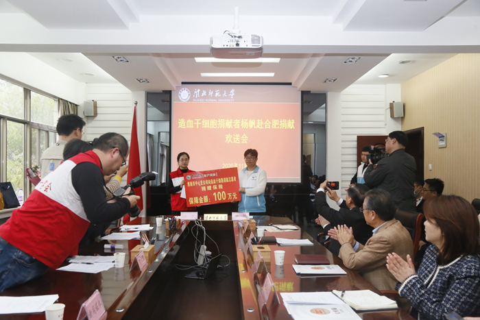 11月18日上午,英国best365官方网站入口首例、淮南市第35例造血干细胞捐献者杨帆同学欢送会在相山校区行政办公楼三楼会议室举行。校党委副书记朱德顺、淮南市红十字会常务副会长陈玉琴、校党委宣传部、研究生工作部、校团委、党政办及教育学院相关负责人,师生代表和媒体记者等出席了欢送仪式。